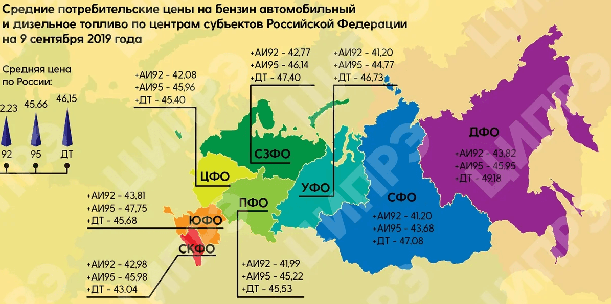 Средняя стоимость по России литра бензина к 9 сентября осталась на уровне 44,60 руб. Цена за литр бензина марок АИ-92 и Аи-95 осталась неизменной и составила 42,23 руб. и 45,66 руб. соответственно. Цена дизельного топлива подросла на 1 коп. до 46,15 руб. за литр.