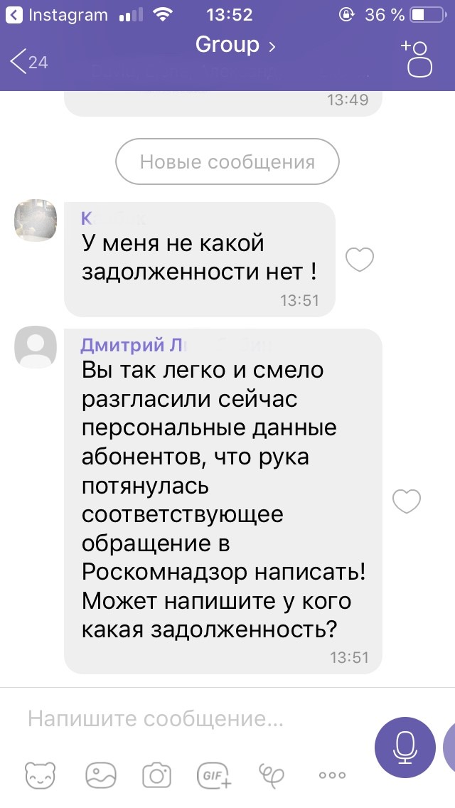 — Вы так легко и смело разгласили сейчас персональные данные абонентов, что рука потянулась соответствующее обращение в Роскомнадзор написать! Может, напишите, у кого какая задолженность? — пишет абонент по имени Дмитрий, телефон которого попал в один из таких групповых чатов.