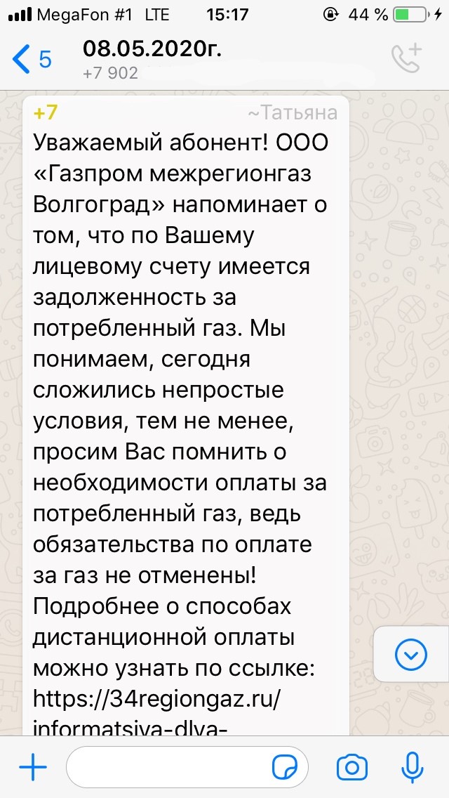 Абоненты ООО «Газпром межрегионгаз Волгоград» в период противокоронавирусного режима самоизоляции стали получать сообщения с напоминанием о долгах. Рассылки проводят в групповых чатах.