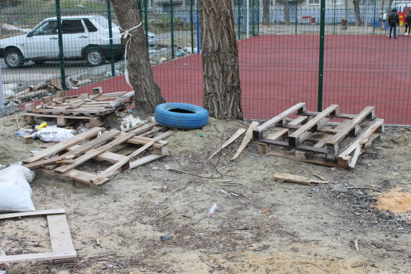 Во дворе повсюду валялся строительный мусор, а от большой клумбы отвалилась штукатурка. Лавочки напротив детской площадки нет, новое освещение частично установлено на пешеходных дорожках, а укрепляющий их бетон лежит местами сверх брусчатки комьями и мешает нормальному передвижению. Однако и это не всё: