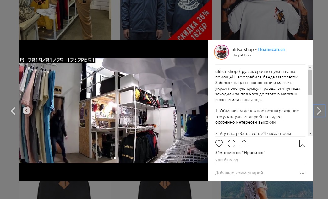29 января 2019 года магазин уличной одежды отечественных марок в Волгограде в своем официальном “Инстаграме” разместил сообщение и видео с просьбой помочь с поиском молодых грабителей. В тексте говорилось, что торговую точку ограбила “банда малолеток”, а ролик демонстрировал, собственно, саму кражу.