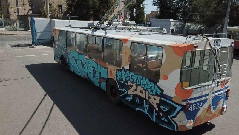 Теперь обычный троллейбус представляет собой настоящий арт-объект и ждет своего часа в депо на “Дворце спорта”.