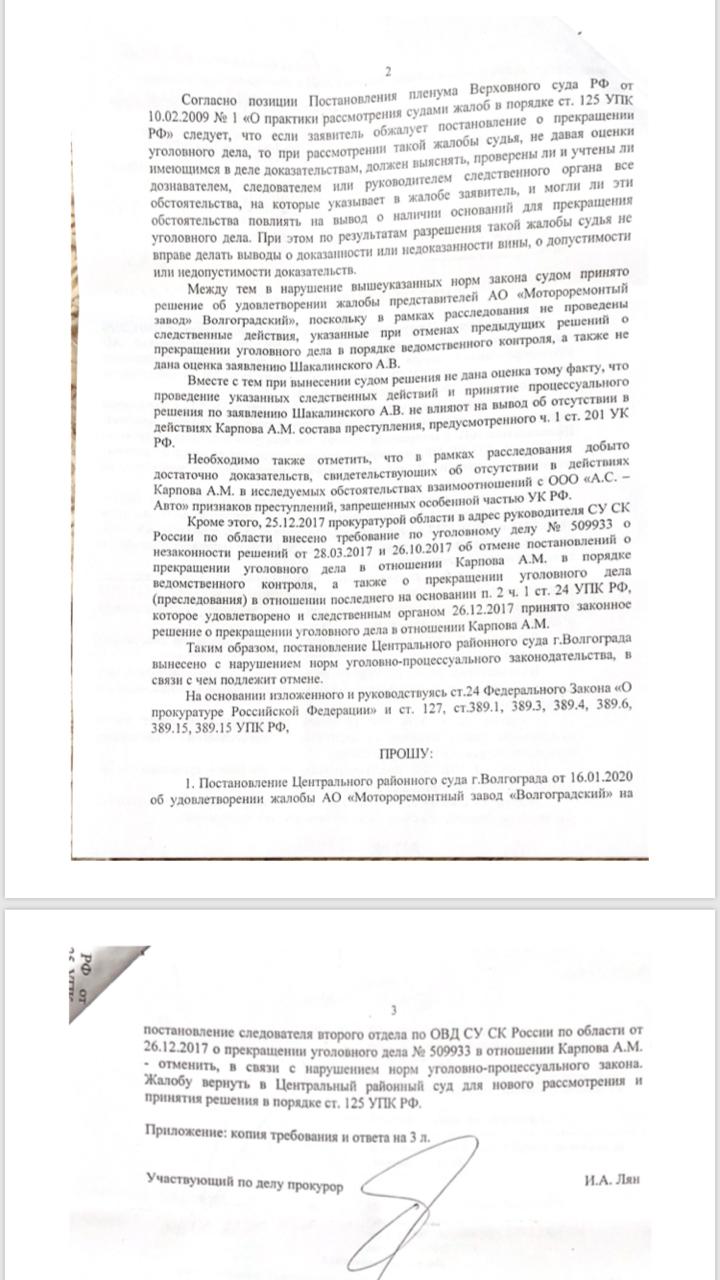 Повторно, 16 января 2020 года, районный суд отменил незаконное Постановление о прекращении уголовного дела. Но радоваться было рано: теперь прокуратура начала заступаться за Карпова, подав апелляционное представление.