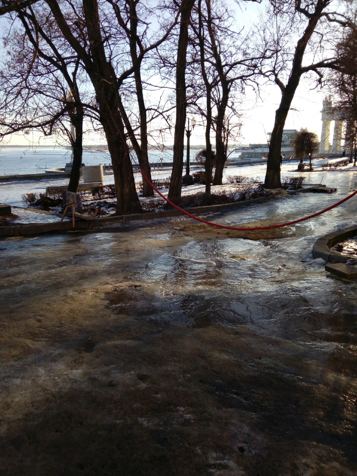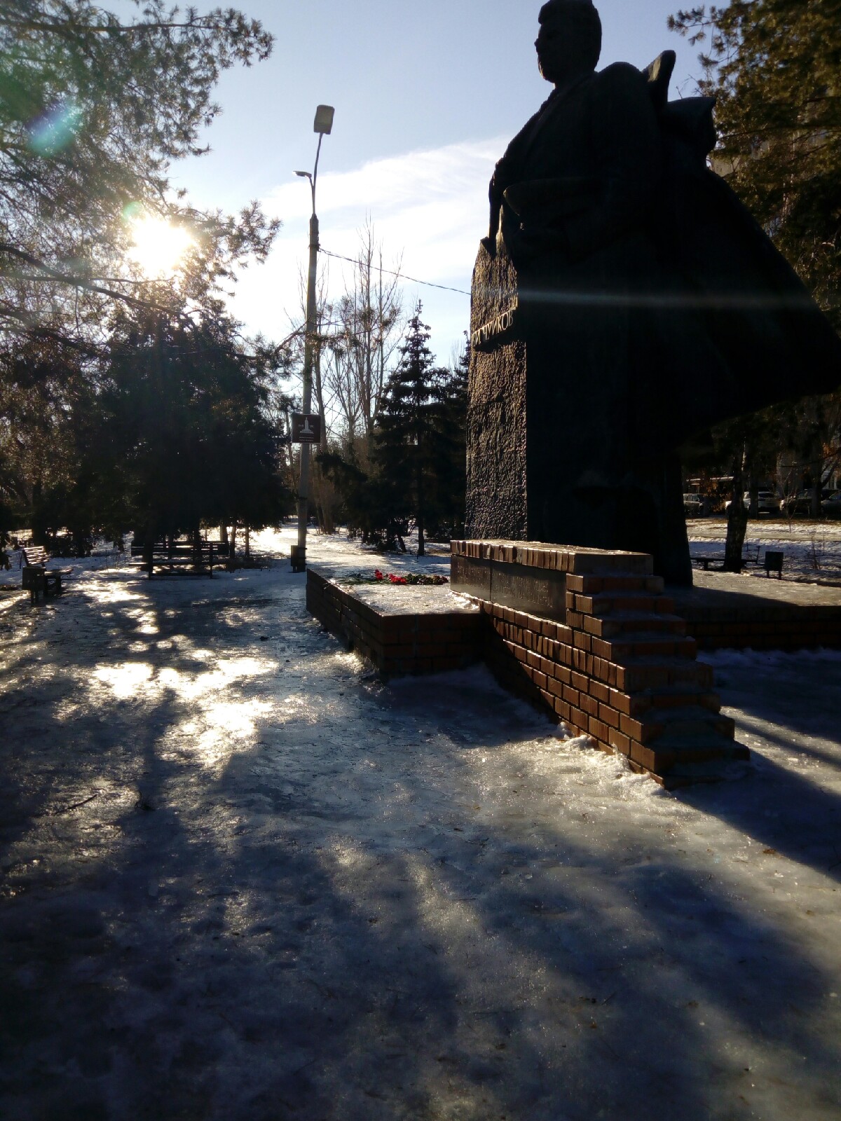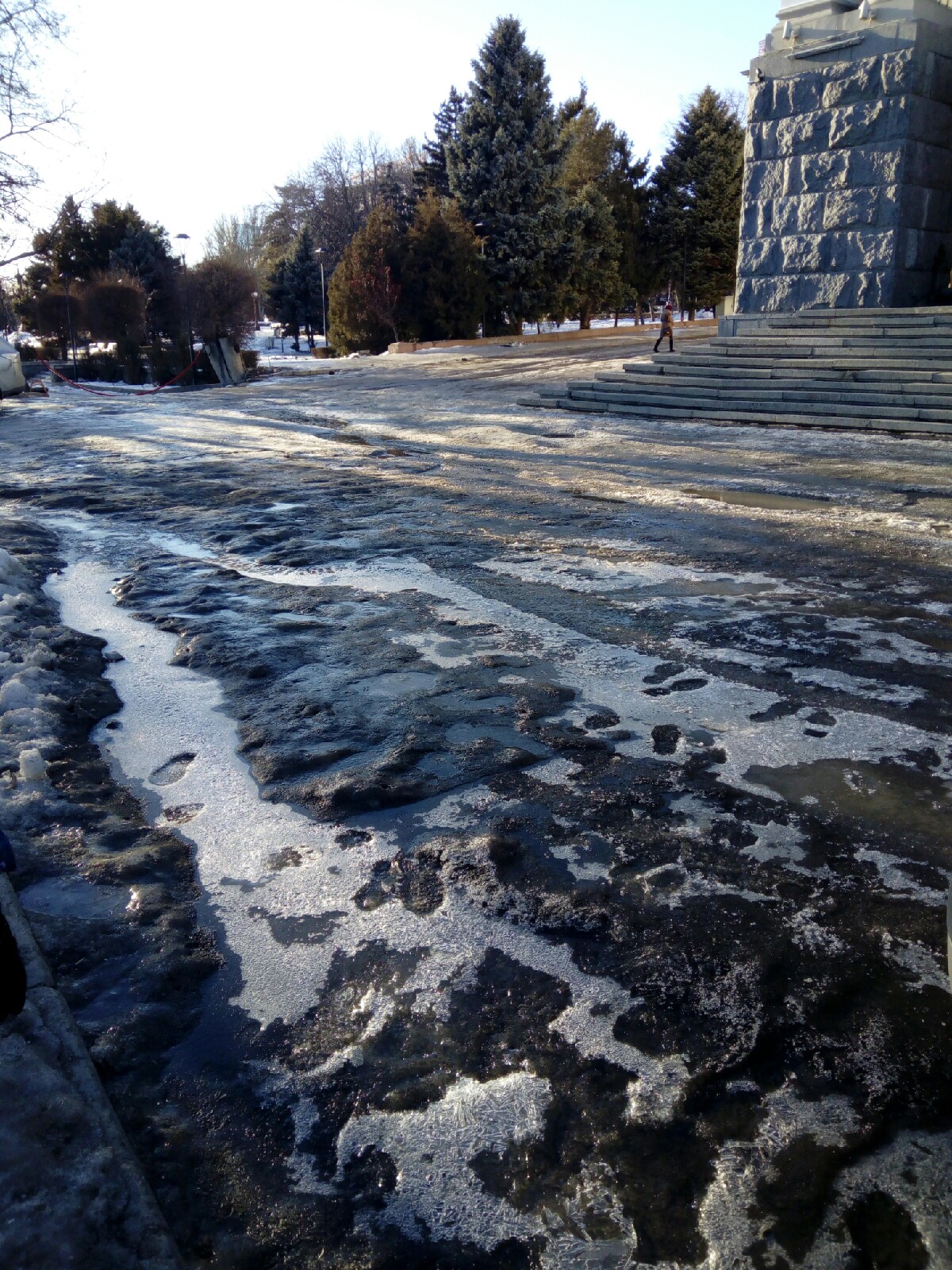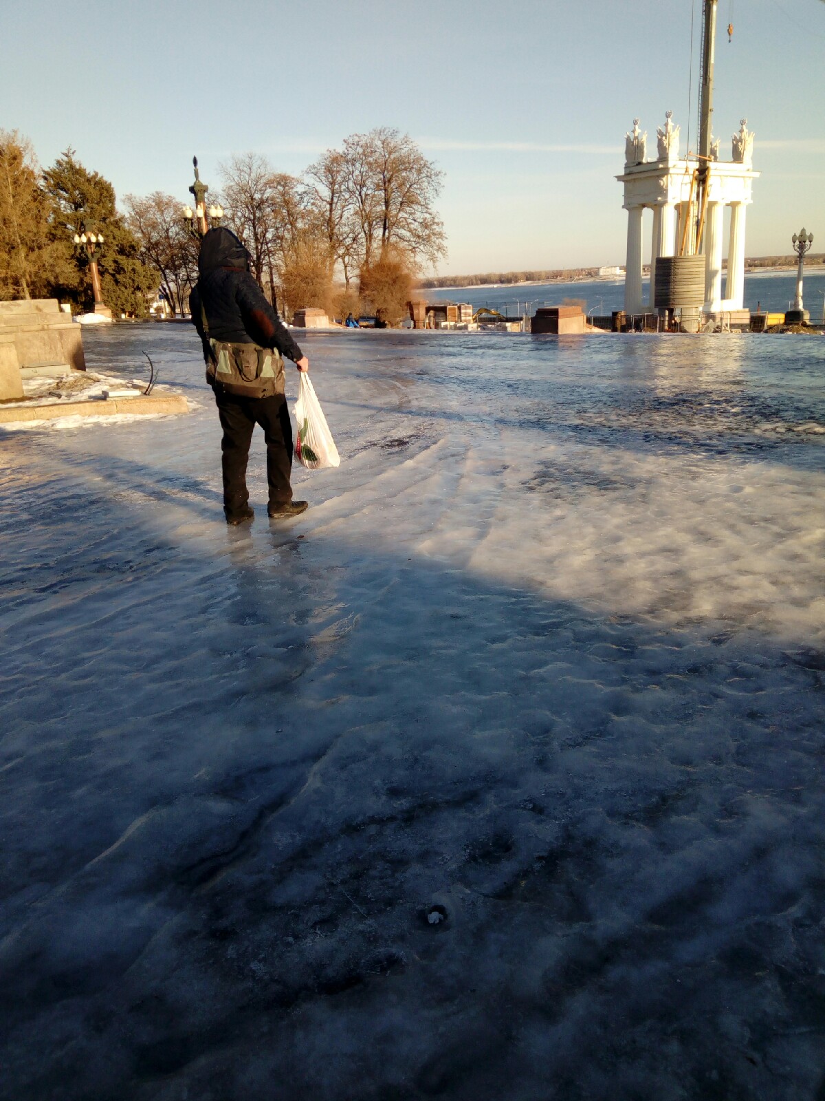 Возле Панорамы люди в рабочих одеждах занимались расчисткой льда. Но далее, где начинается парковая территория, сверкающий от солнечных лучей лед был “не тронут рукой человека”. Чтобы дойти до памятника Чуйкова, мимо которого пролегает дорога к Центральной набережной, нужно идти медленными шагами, удерживая равновесие.
