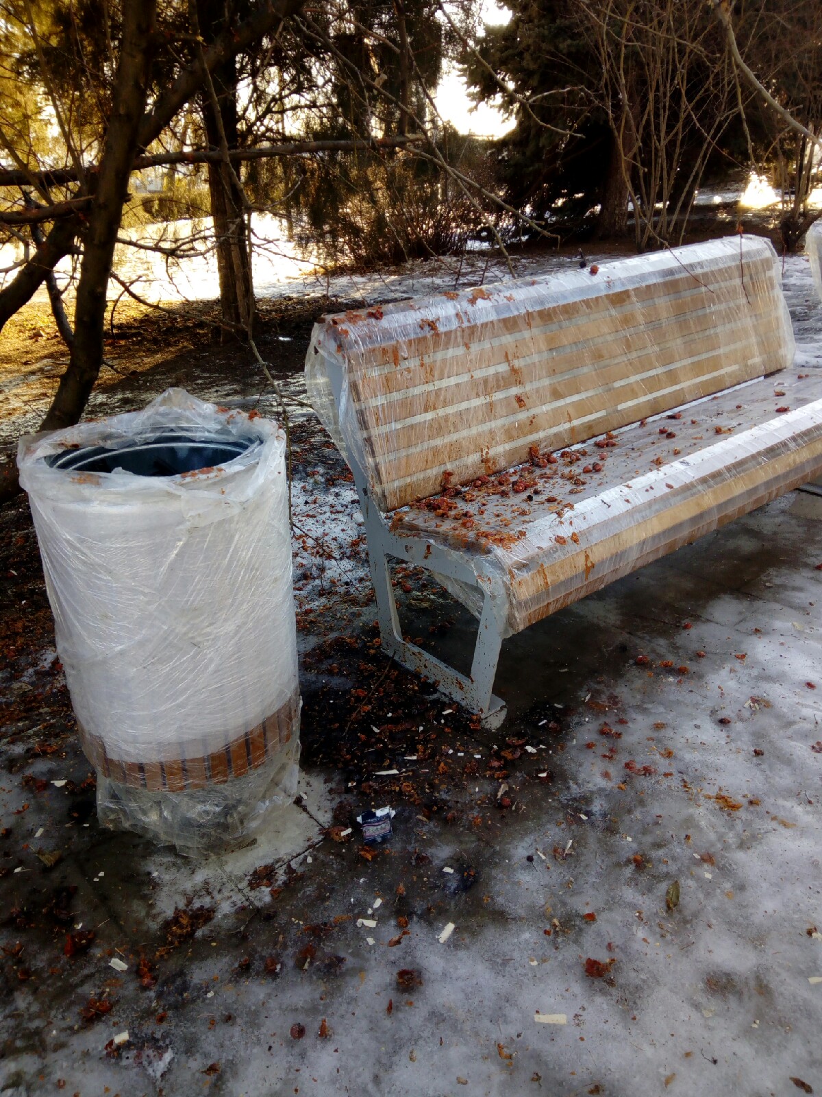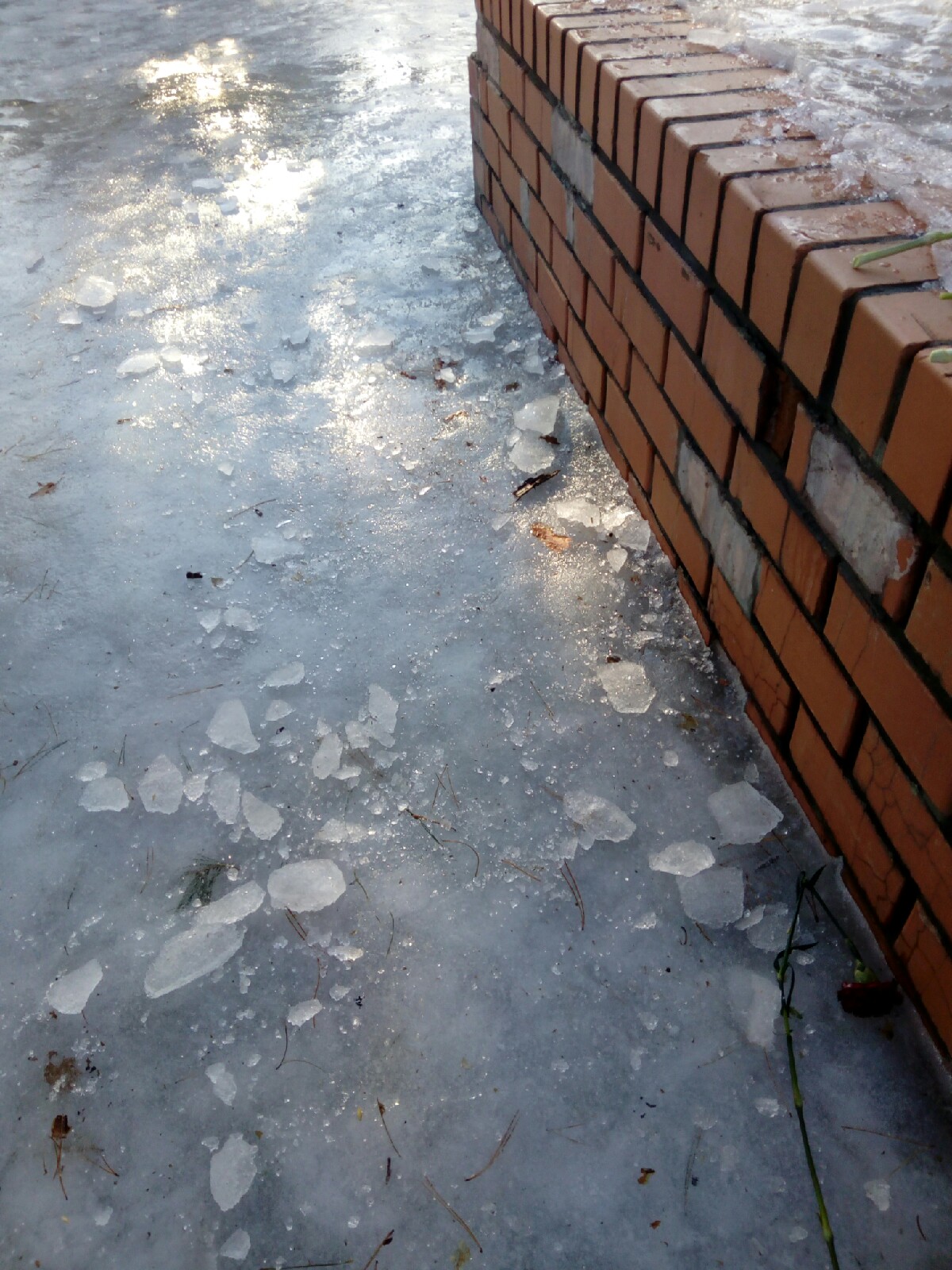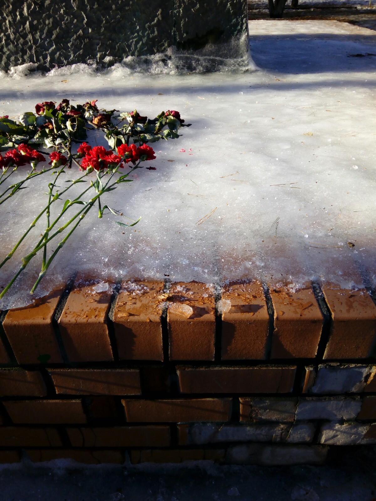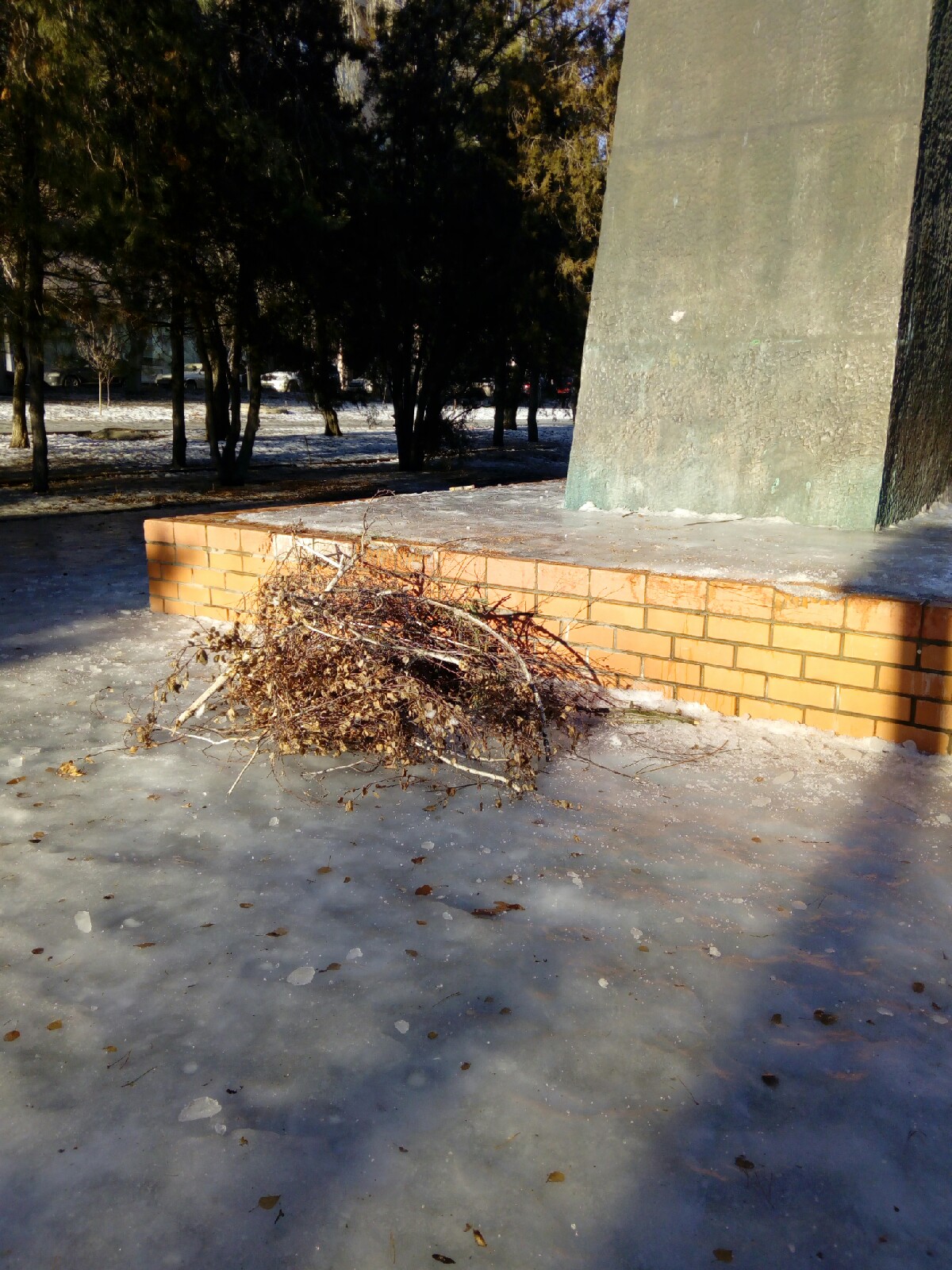 Лед сковал памятник основательно. Он не только вокруг, но и на постаменте, куда туристы возлагают цветы. Картину “дополняют” валяющиеся рядом ветки деревьев.