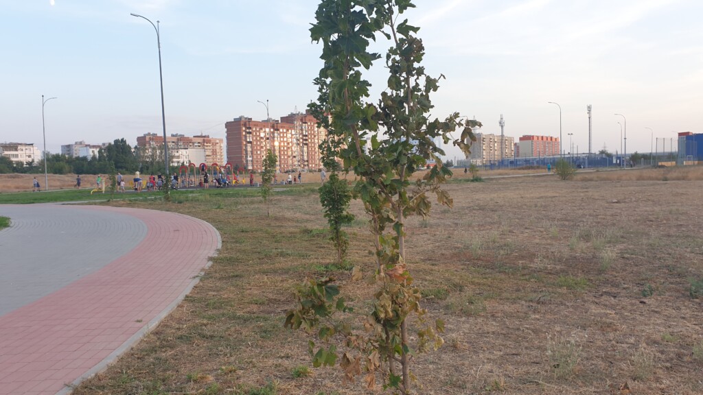 Какого же было удивление горожан когда они увидели, как парк стал засыхать во второй раз! К середине лета множество деревьев пожелтели и скинули листву. В августе некоторые из них уже выкорчевали, еще часть продолжает гибнуть. Полив в парке будто осуществляется выборочно — явно заметно, что одни лунки хорошо напитаны водой, а другие остаются сухими.