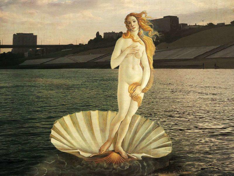 Картину “Рождение Венеры” (итал. Nascita di Venere) написал итальянский художник тосканской школы Сандро Боттичелли. Согласно мифу, богиня возникла из морской пены. Она была полностью обнажена и стояла в раковине. Журналисты представили, будто она появляется из Волги. На наш взгляд, получилось не менее эпично.
