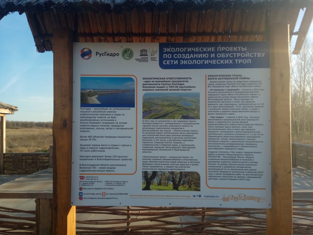 Экологическую тропу под названием «Три озера» в Волго-Ахтубинской пойме открыли в 2019 году. Прямо в 20 метрах от жилых домов соорудили навес из соломы — место стоянки для туристов.