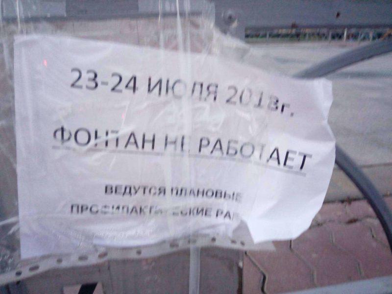 По данным ИА “СоцИнформБюро”, новый сухой фонтан, открытый с помпой 6 мая этого года, закрыли на “плановые профилактические работы”. Именно так гласит объявление, напечатанное на листе формата А4 и прикрепленное к ограждению фонтана. Однако по факту дела обстоят куда серьезнее.