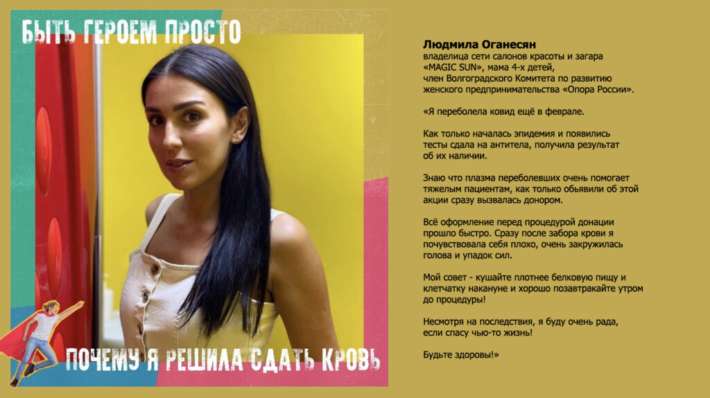 Также, для «ГЕРОЕВ» акции, Комитет по развитию женского предпринимательства «Опора России» подготовил специальные подарки, которые сможет получить каждый донор, сдавший кровь с антителами. Подробности об условиях получения подарков смотрите в аккаунте @oporowoman_vlg.