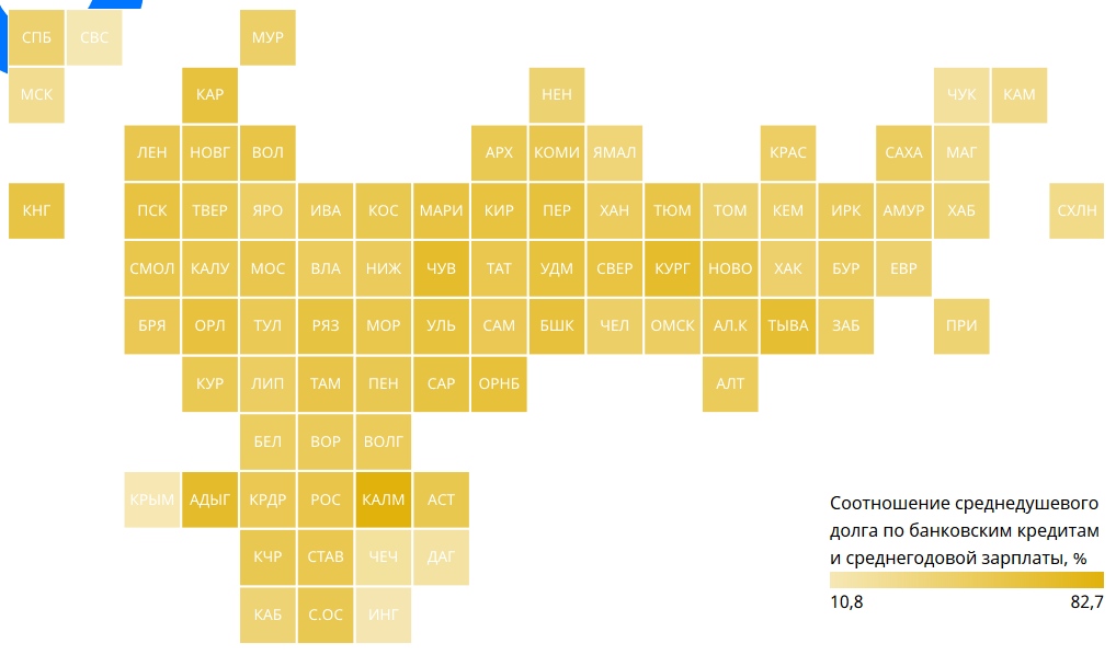 Средний уровень закредитованности по стране составляет 45%, а диапазон по регионам – от 11% до 83%. Наименее закредитованные регионы находятся в южной части России, наиболее – в северной. Случай с Крымом особый: с одной стороны, регион недавно в составе страны, с другой – там не работают крупные банки.