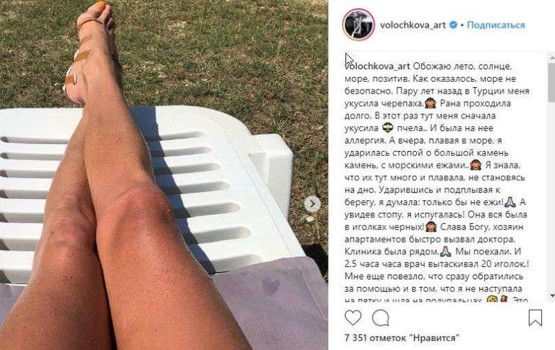 По данным ИА “СоцИнформБюро”, Волочкова наступила на морского ежа. В «Инстаграме» она рассказала подробности случившегося.