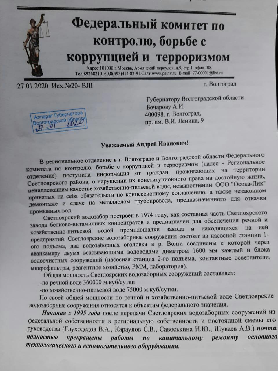 В своем обращении Федеральный комитет указывает, что с 2002 года все сточные воды от поселка р.п. Светлый Яр, не имеющего централизованного водоотведения, без очистки сливались на отстойники завода БВК.