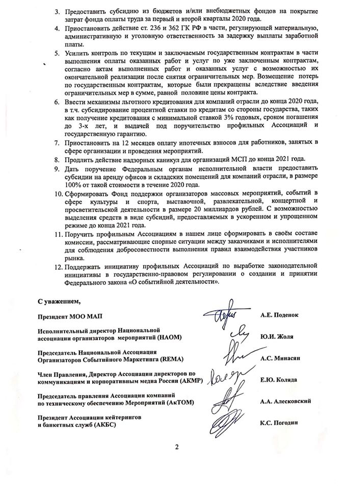 «Хотим обратить ваше внимание на возникшие чрезвычайные обстоятельства на нашем рынке, связанные с отменой всех мероприятий до снятия ограничительных мер. В организации мероприятий принимают участие более 100 тыс. юридических лиц, индивидуальных предпринимателей и самозанятых граждан. С учетом остановки деятельности мы не можем выполнять свои коммерческие, налоговые, кредитные, зарплатные и социальные обязательства. Общее число работников, занятых в нашей отрасли, составляет до 500 тыс. человек, без учета членов семей», – сообщили авторы письма.