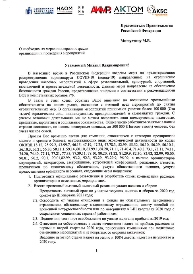 В частности авторы письма просят разработать схемы компенсации расходов организаторам в отмененных мероприятиях, ввести временный льготный режим по уплате налогов и сборов, в том числе полностью освободить от уплаты налога на прибыль за прошлый год, ввести льготную ставку налога на землю и льготный налог на имущество в 2020 году.
