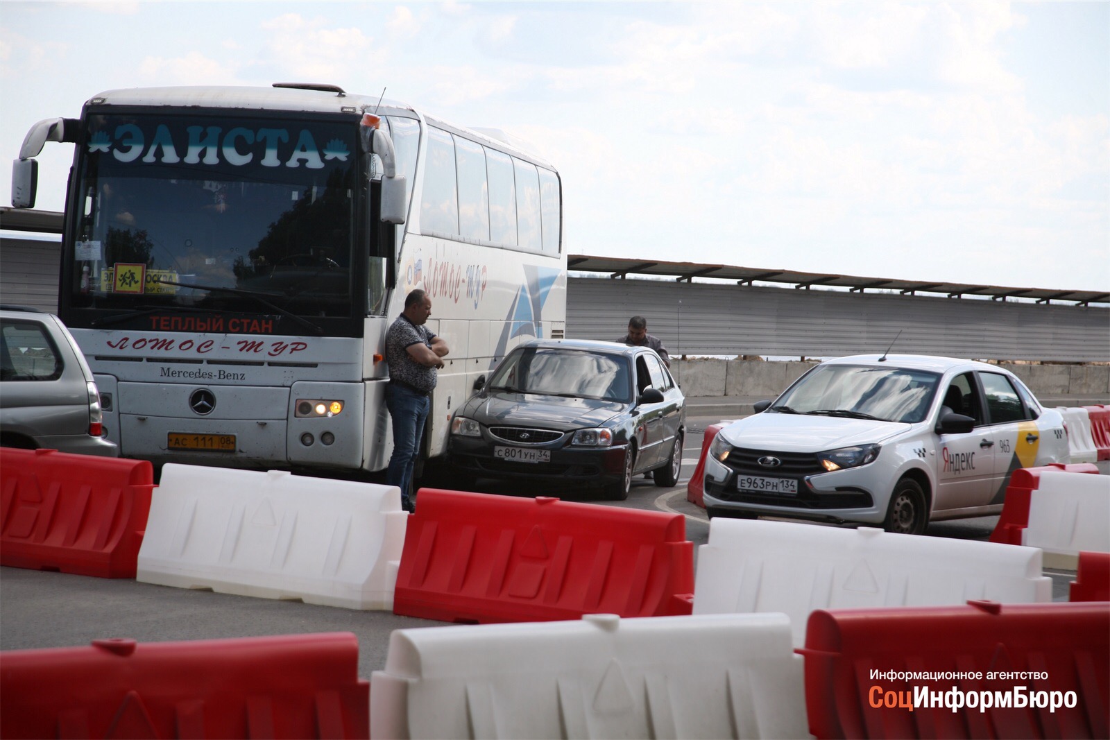 Днём параллельно ДТП с нелегальной маршруткой и иномаркой на ул. Комсомольская в Волгограде произошла ещё одна авария. Экскурсионный автобус поворачивал с правой полосы на круговом движении на пересечении Нулевой рокадной и ул. Комсомольской. Однако водитель не рассчитал габариты транспорта и прижал иномарку Hyundai Accent, которая передвигалась в левом ряду.