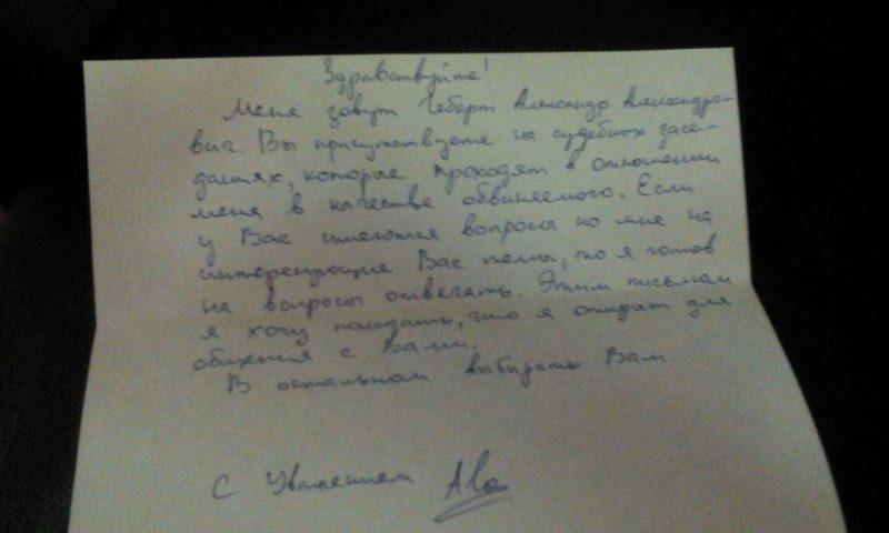 В ожидании начала заседания Геберт через адвоката передал письмо журналистам, в котором написал, что открыт к общению.