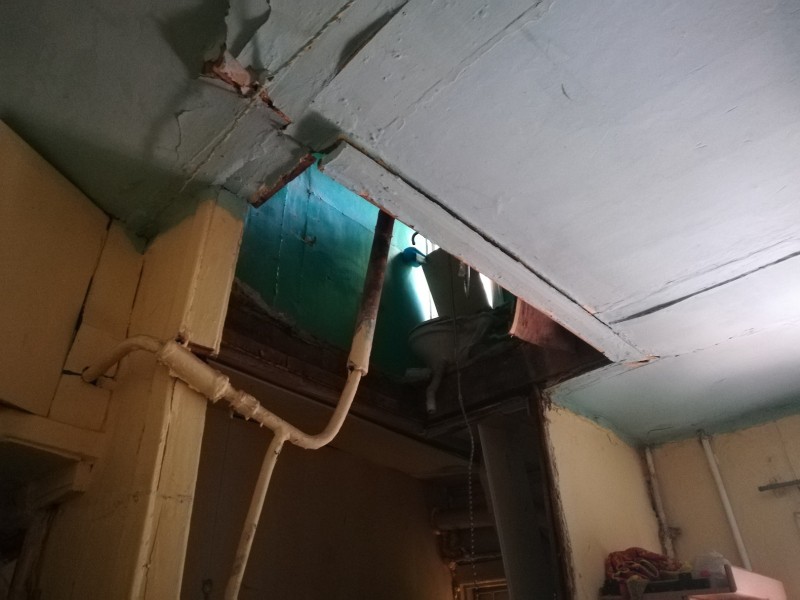 В конце мая этого года в доме обрушился неиспользуемый дымоход. В результате повредилось перекрытие между квартирами на первом и втором этажах.