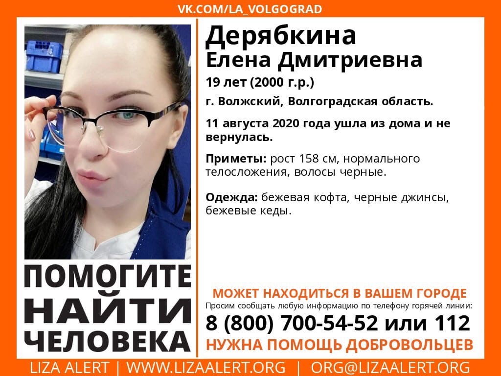 Поисковый отряд Лиза Алерт опубликовал ориентировку на поиск Дерябкиной Елены, 19-летней жительницы города Волжский. Двушка вышла из дома 11 августа и до сих пор не вернулась.