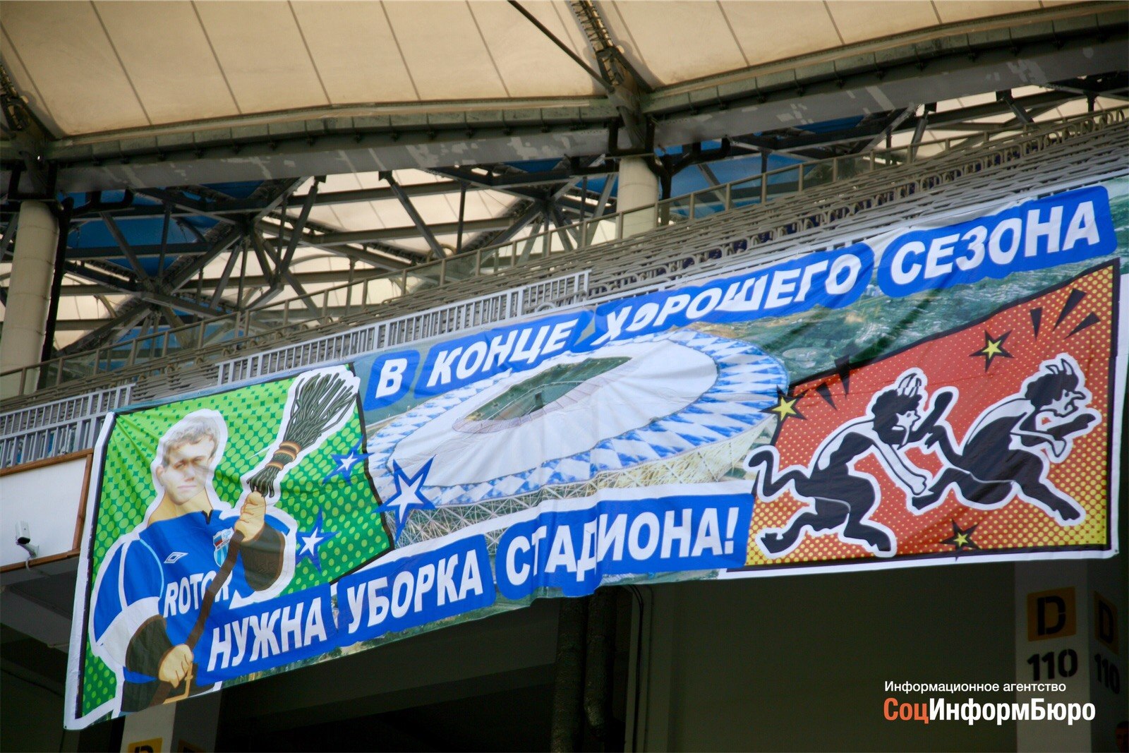 Фан-сектор встретил гостей приветливым баннером с форвардом Олегом Николаевым, держащим в руке метлу, и чертями, которые бегут со стадиона: “В конце хорошего сезона нужна уборка стадиона”. Отметим: команду гостей как раз называют “чертями”.